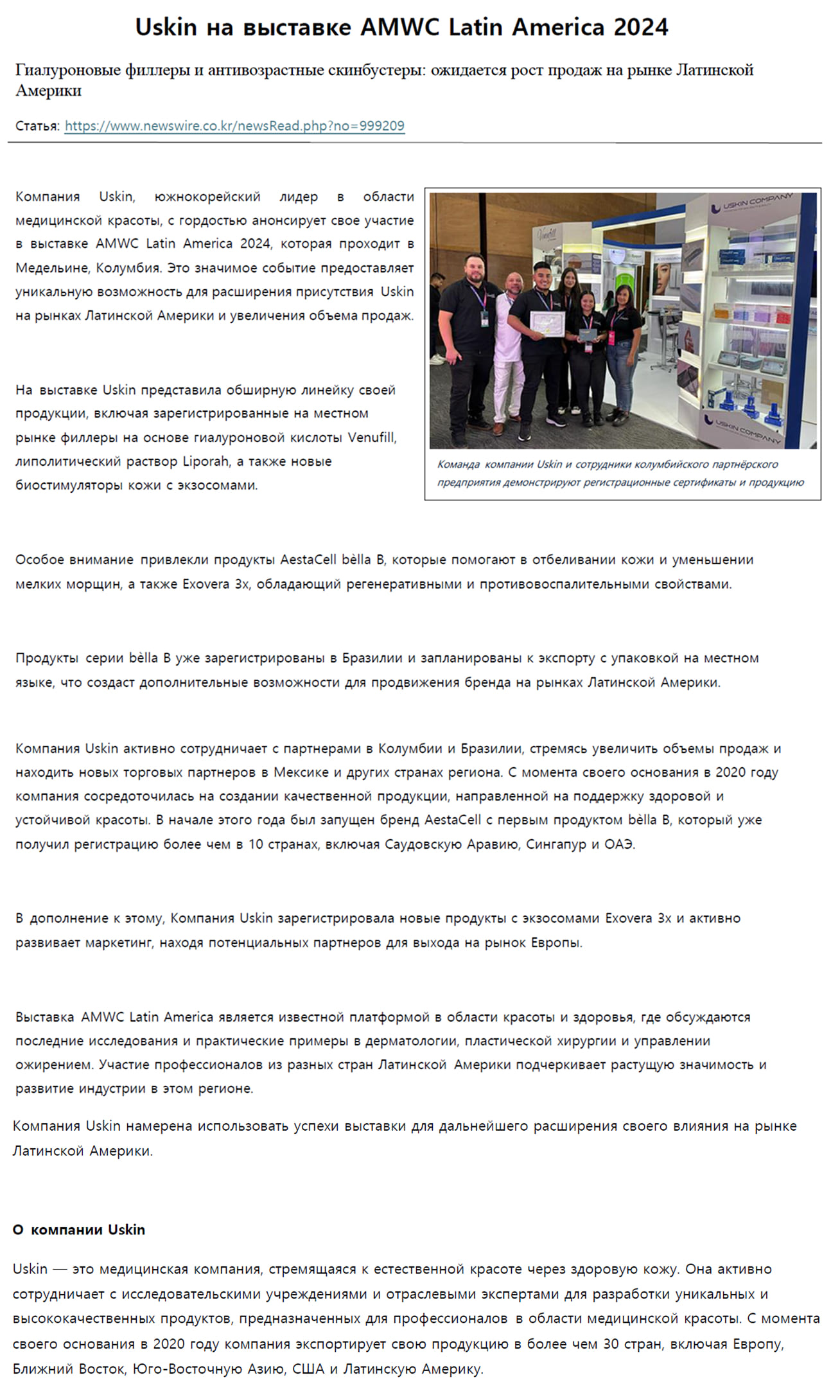 Главная / Новости / Новости Новости Новости Новости Выставки Новости Выставки Uskin Company принимает участие в AMWC Latin America вместе с партнёром Sardenya Colombia Author uskinlab_usr Date 2024.10.23 Views 43 https://www.newswire.co.kr/newsRead.php?no=999209 Prev Uskin Company заключает партнёрство с Yyoung Medical International для расширения продаж в Китае Next Сотрудничество с Yyoung Medical International, расширение продаж в Китае List